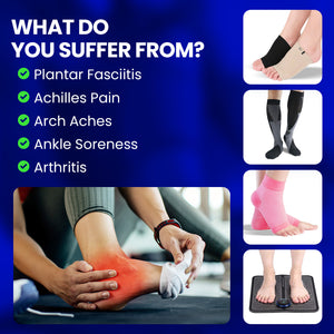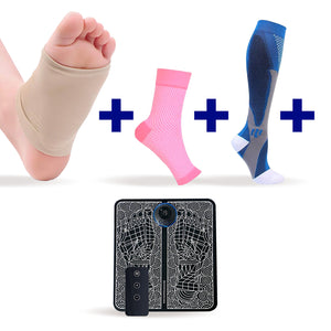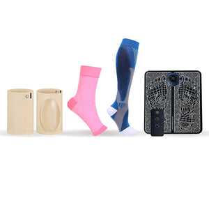 with our Ultimate Foot Care Bundle — a powerful 4-in-1 solution designed to support your feet, ankles, and legs all day long. Whether you suffer from plantar fasciitis, swelling, arch pain, or tired legs, this bundle has you covered from heel to toe.